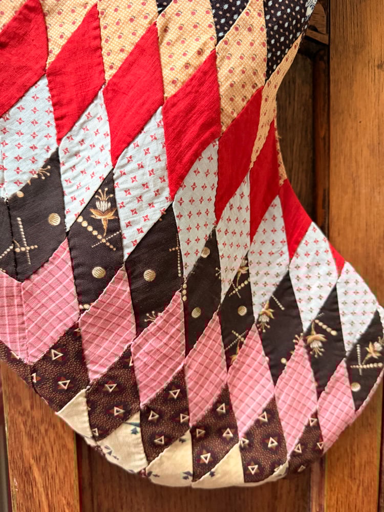 Fully lined with white vintage cotton, backed in red cotton and trimmed with a ric-rac ribbon hanging loop.